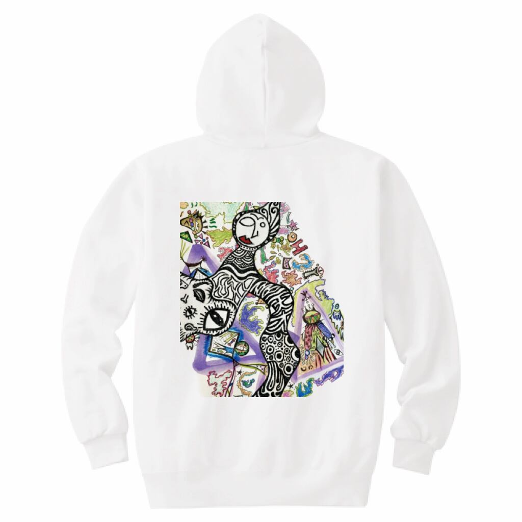 このパーカーは、ユーモアとファンタジーが融合したデザインで、常識を覆す独自の世界観を表現しています。